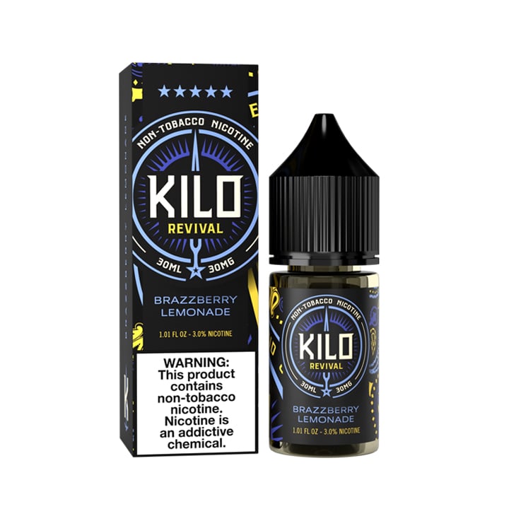 Brazzberry Lemonade Salt Nic Vape Juice by Kilo Revival is a refreshing all time favorite, featuring a medley of fresh berries and KILO’s signature blue razz fused with citrusy lemonade. This zesty, sweet lemonade with candy blue raspberry drizzled on top is sure to be your next all day vape.