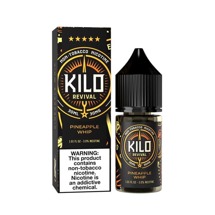 Pineapple Whip Salt Nic Vape Juice by Kilo Revival is the perfect blend of pineapple flavors with sweet vanilla ice cream. This fruity and creamy e-liquid is sure to be your next tasty tropical summer treat.