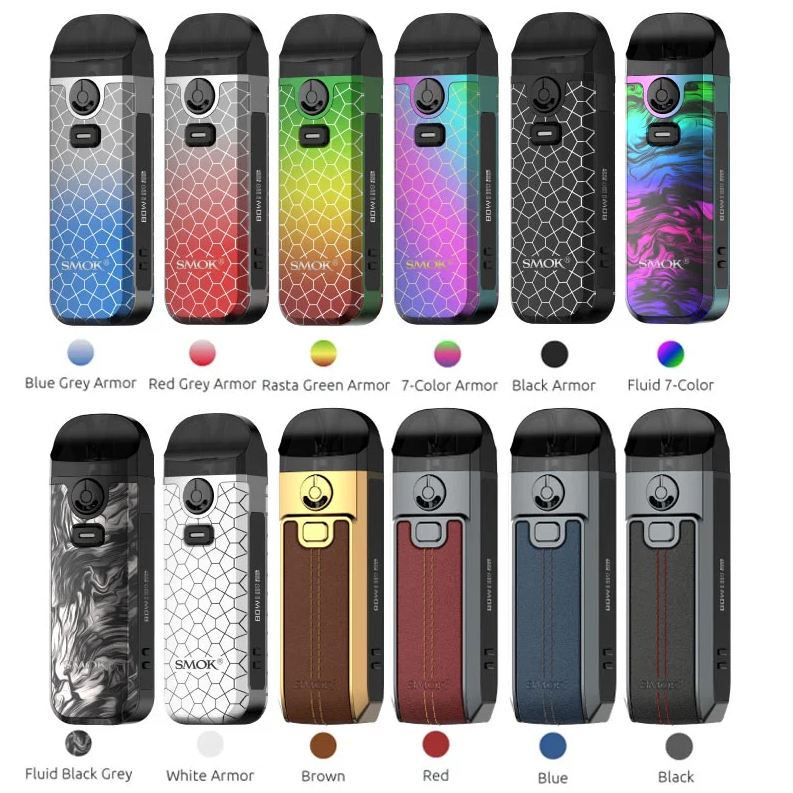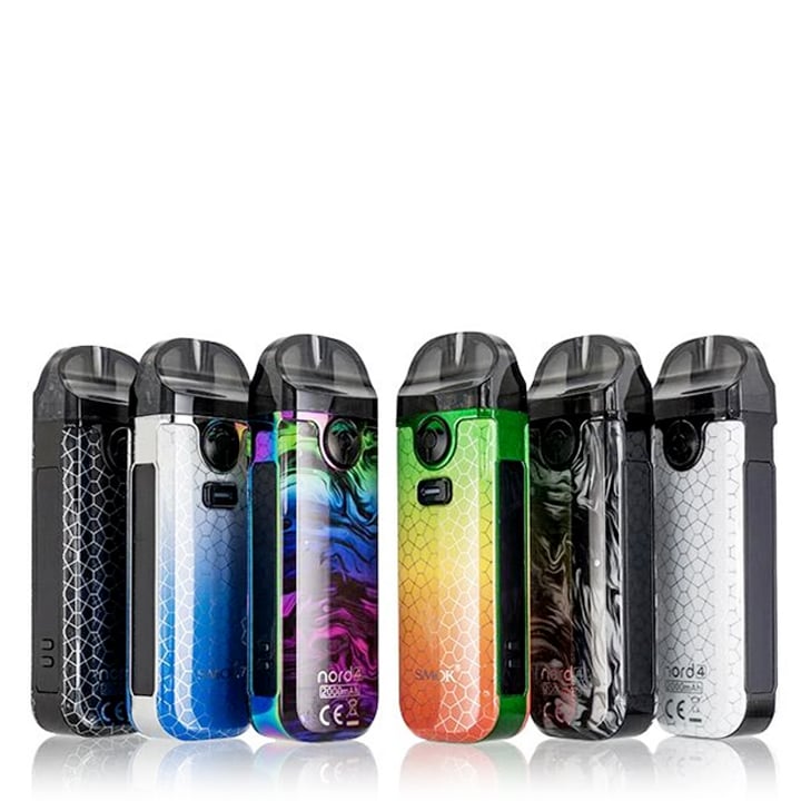 The SMOK NORD 4 Kit takes the wildly popular SMOK NORD X Pod System and added even more additional perks. The NORD 4 features an OLED display screen, an upgraded long-lasting 2000mAh rechargeable battery, and the ability to fire up to 80W. Featuring a 4.5mL refillable cartridge design that’s compatible with Original RPM and RPM 2 Coils. This offers users with an array of different coil options to suit all vaping preferences. Changing the traditional pattern color while still offering the color in SMOK’s signature “Fluid” line while additional offering a leather series of devices. The SMOK NORD 4 Pod Kit offers phenomenal handling with compact size and weighted feel for an amazing in-hand vape experience. The rechargeable 2000mAh internal battery offers one of the bigger capacities in the pod system segment, activated via a single-button. The NORD 4 Pod System has a maximum capacity of 4.5mL, featuring a refillable cartridge design with replaceable coil system. The kit includes one RPM Pod with a 0.4ohm Mesh Coil while also including a RPM 2 Pod with a 0.16Ω RPM 2 Mesh Coil catering to the sub-ohm, cloud-focused segment.