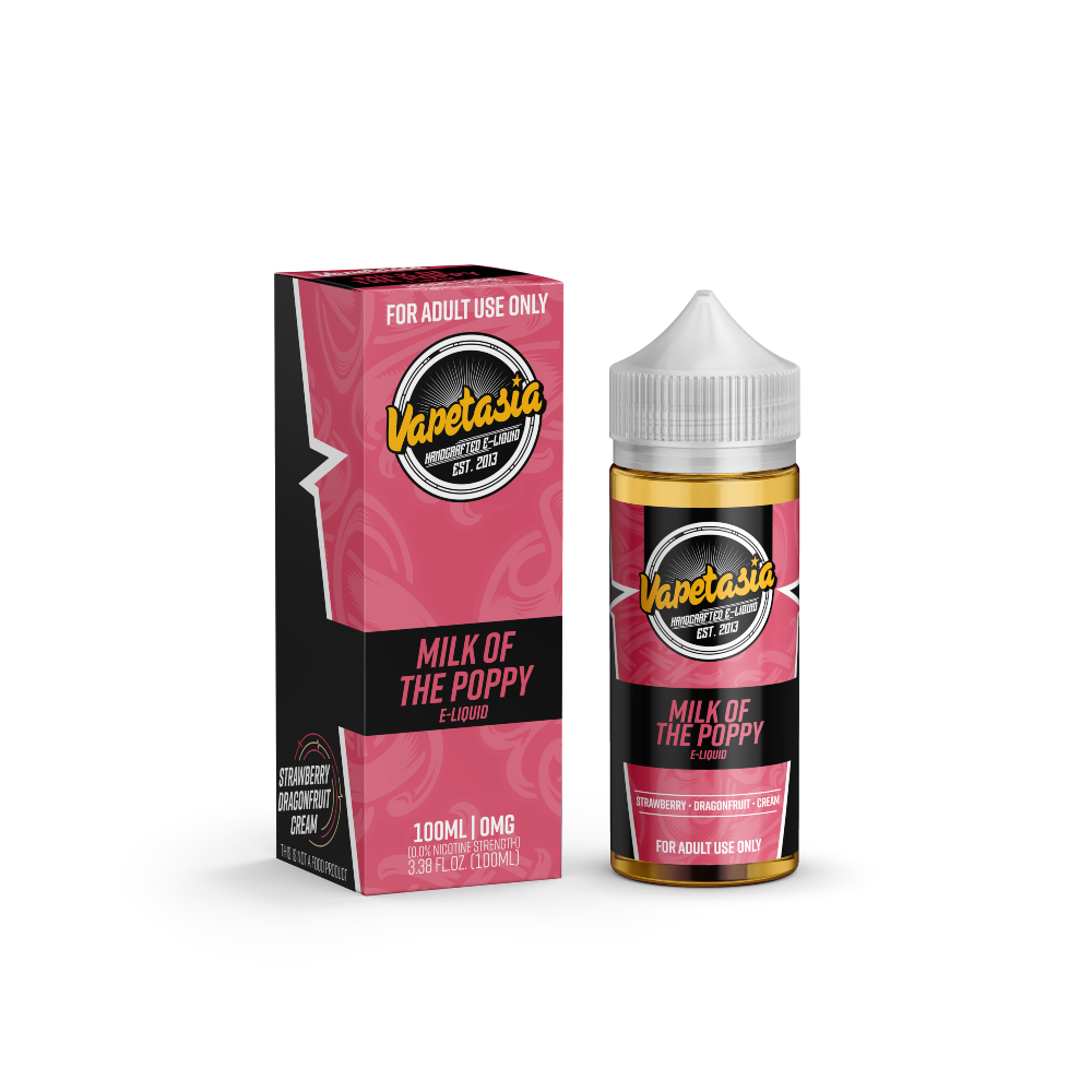 Milk of the Poppy by Vapetasia E-Liquid is a gourmet fruit dessert juice made with a buttery vanilla cream base paired with a sweet ripe strawberry flavor with subtle hints of exotic dragon fruit.